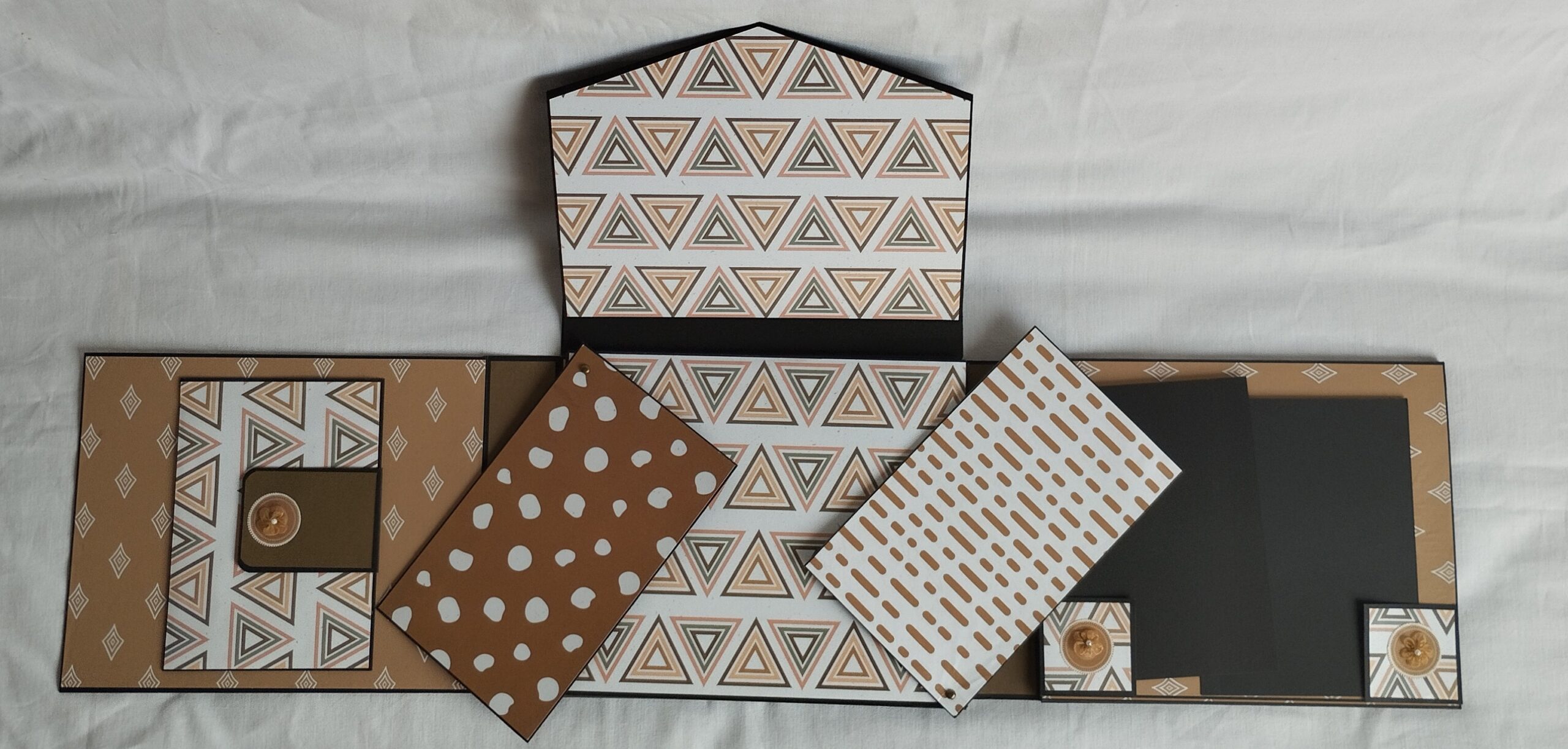 Album papier comportant des ouvertures en 3 volets droite gauche et haut bas Fermeture de l’album par un aimant.