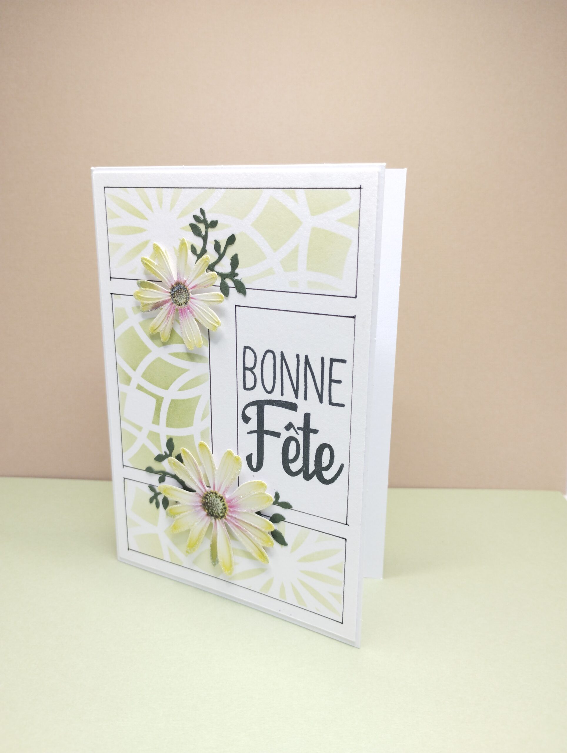 Carte vendue avec son enveloppe, réalisée avec de l’encre, un pochoir, des dies feuillages et des embellissements fleurs.