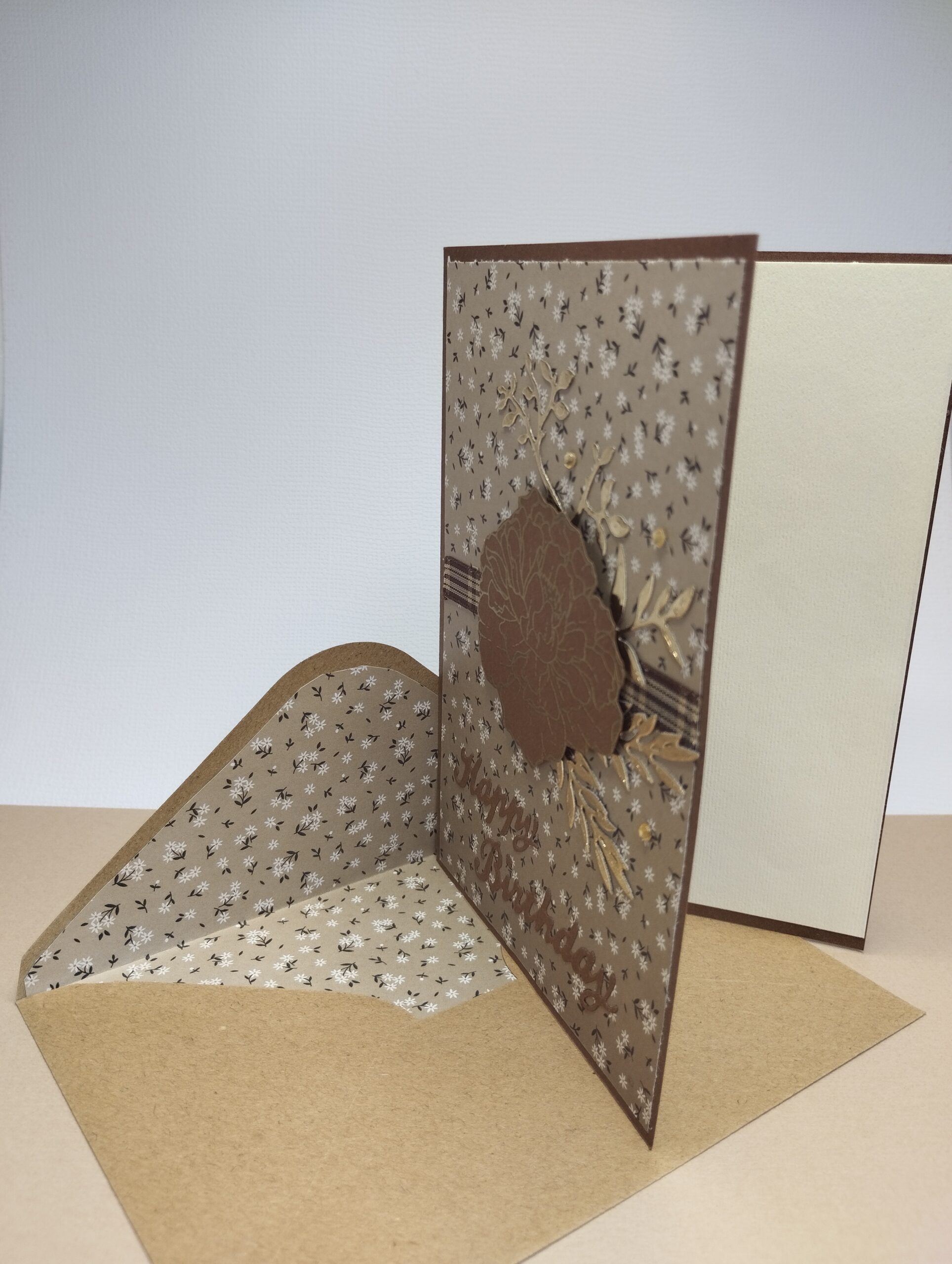 Carte réalisée avec du papier fleuri beige, du ruban et une fleur embossé avec de la poudre dorée.