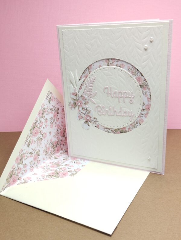Carte réalisée avec du papier gauffré, du papier imprimé fleur, des dies fleurs et feuillage et 4 perles blanches.