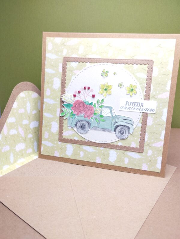 Carte simple réalisée avec du papier fleuri et tampon. Enveloppe fournie.