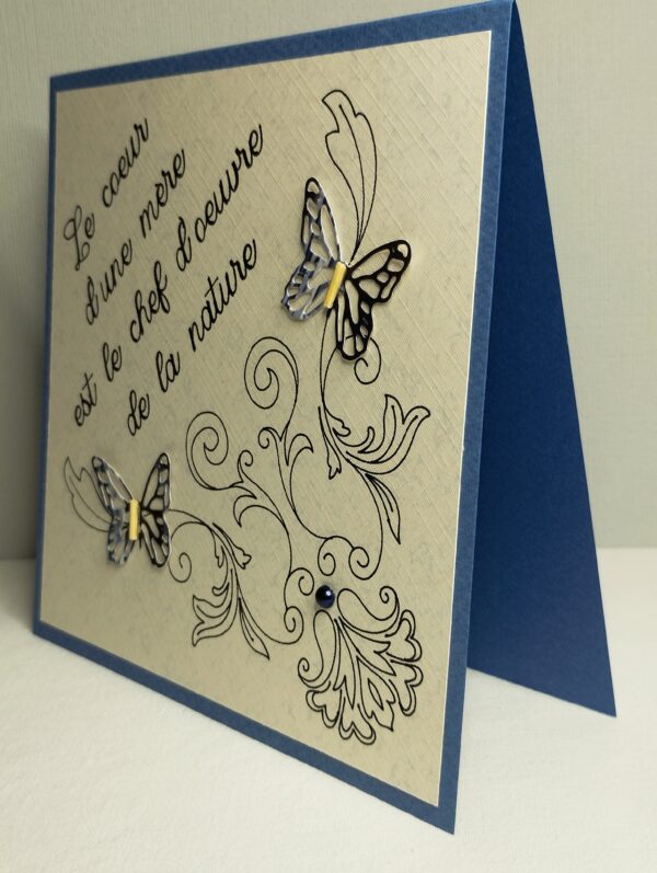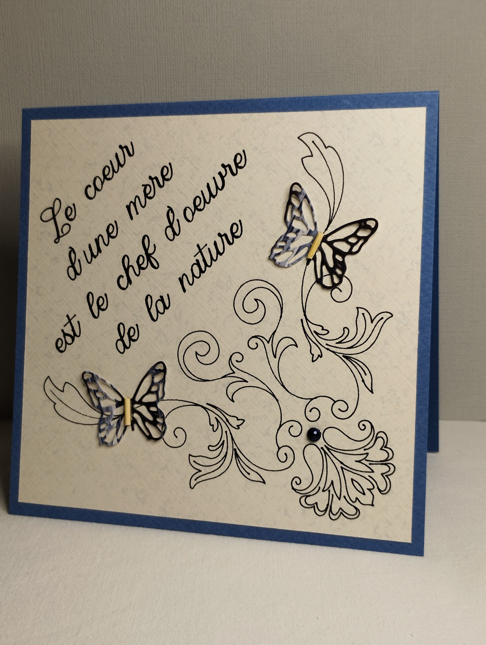 Carte réalisée avec du papier aquarelle blanc de 300 gr. Le dessin est réalisé avec des tampons et coloré à l’aquarelle assorties de 3 Enamels dots de couleur vieux rose. L’écriture est réalisé avec un feutre noir.