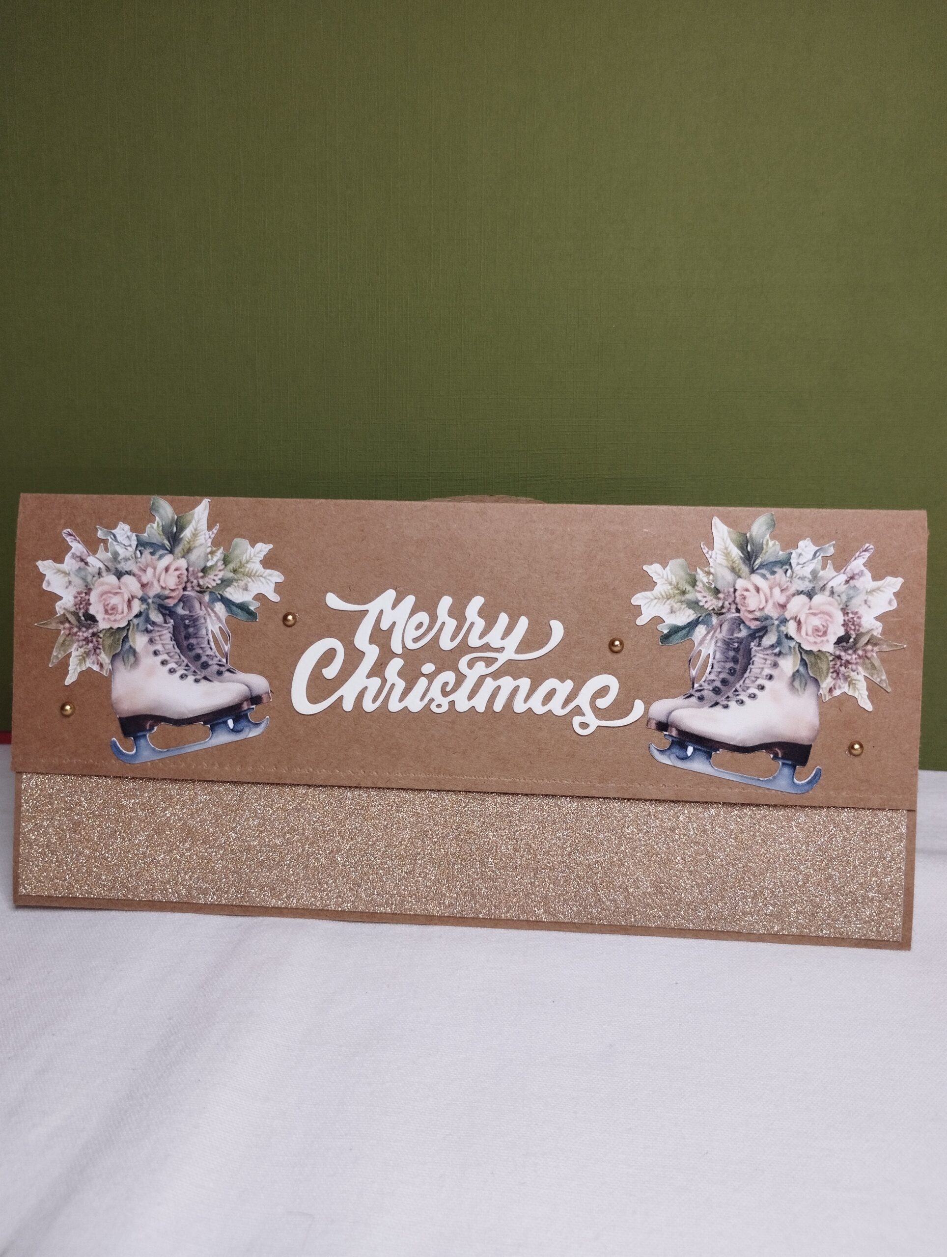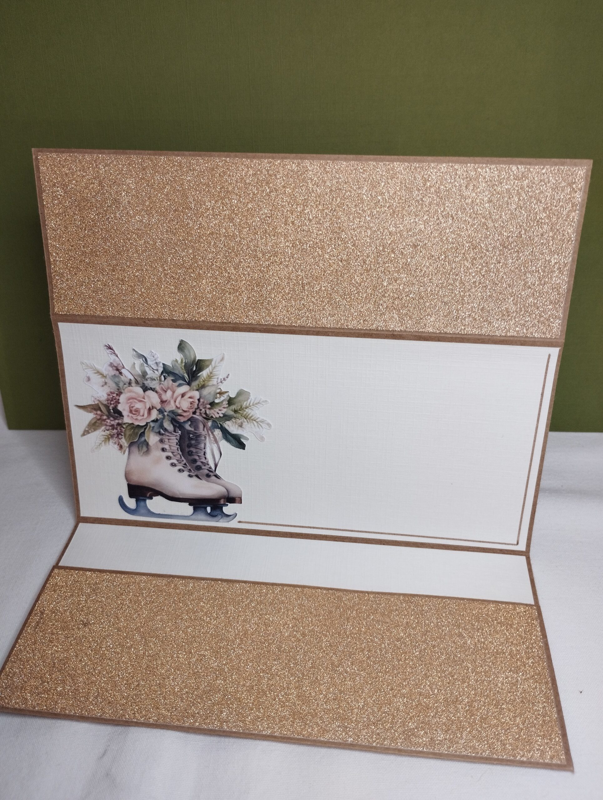 Le devant de la pochette est décoré avec des images de patin à glace et 4 perles dorées.